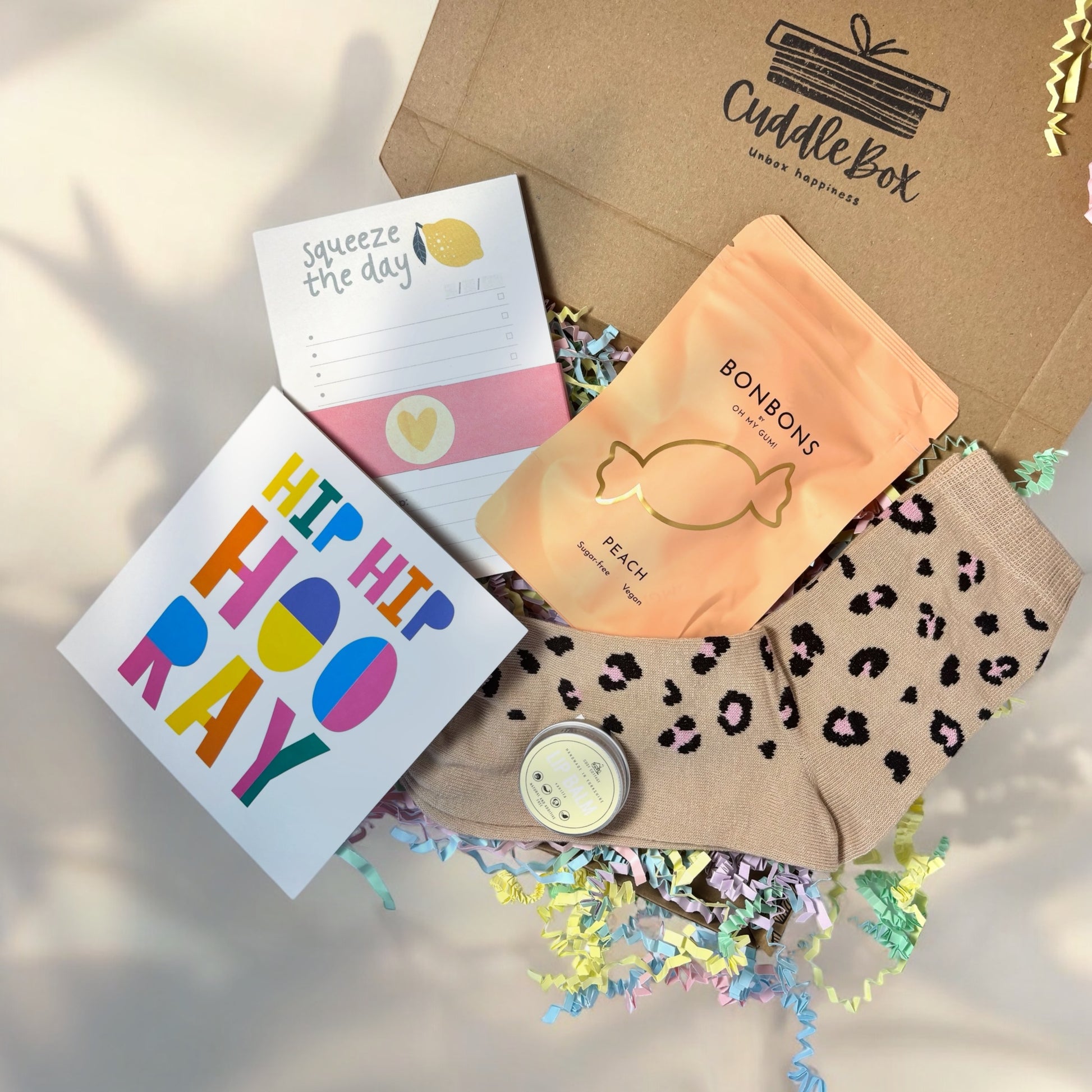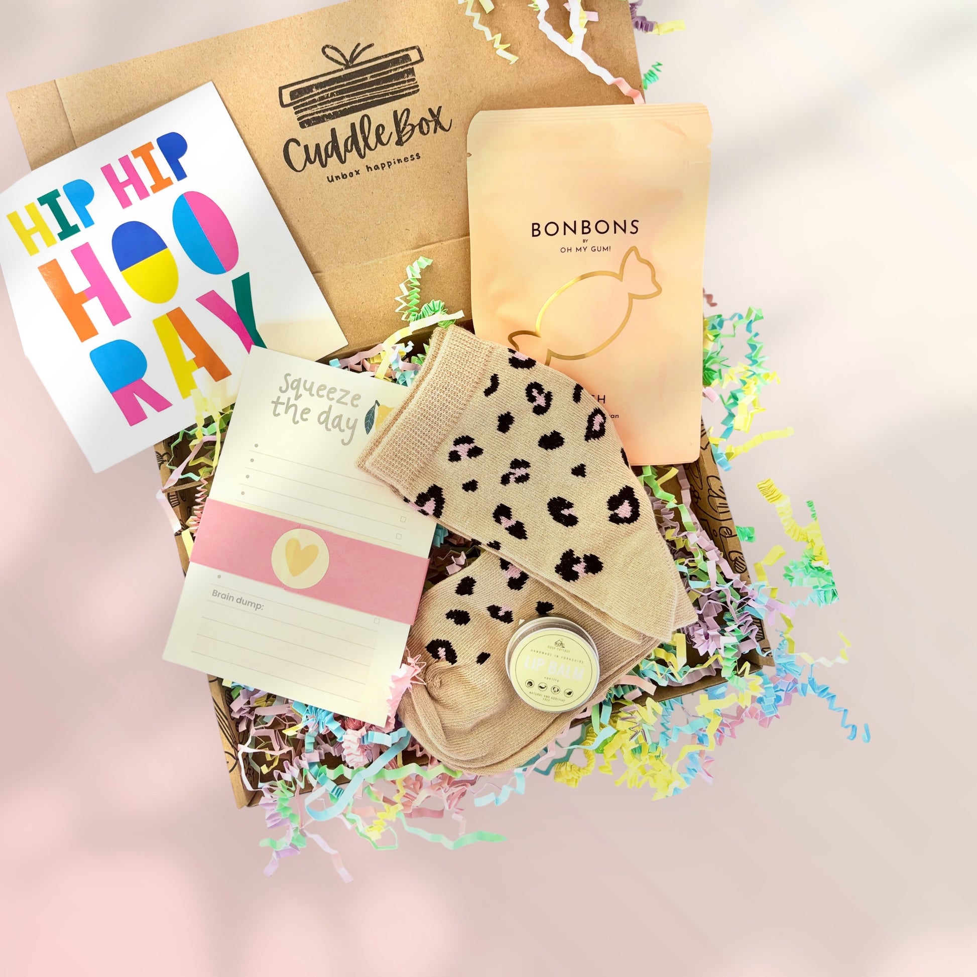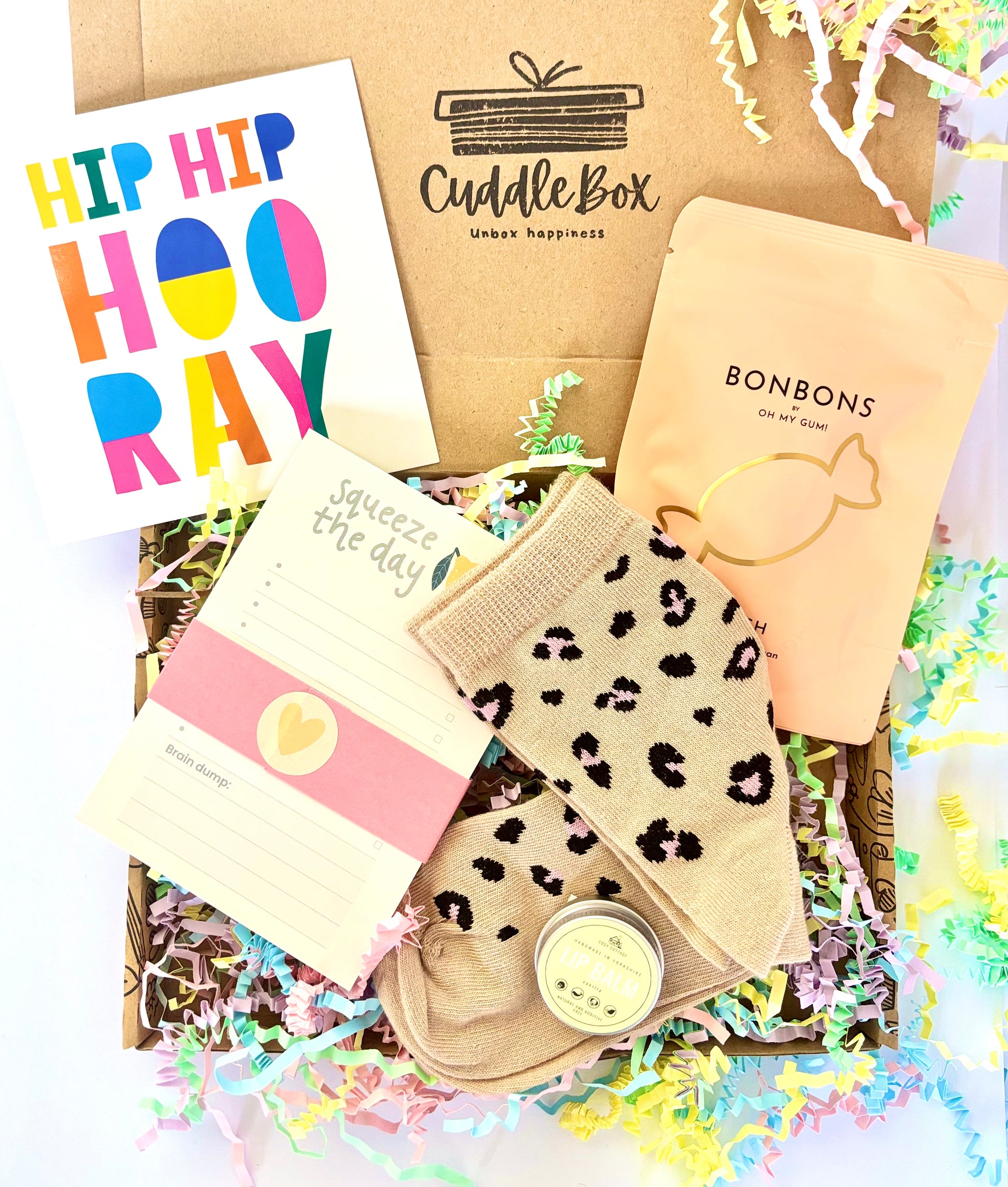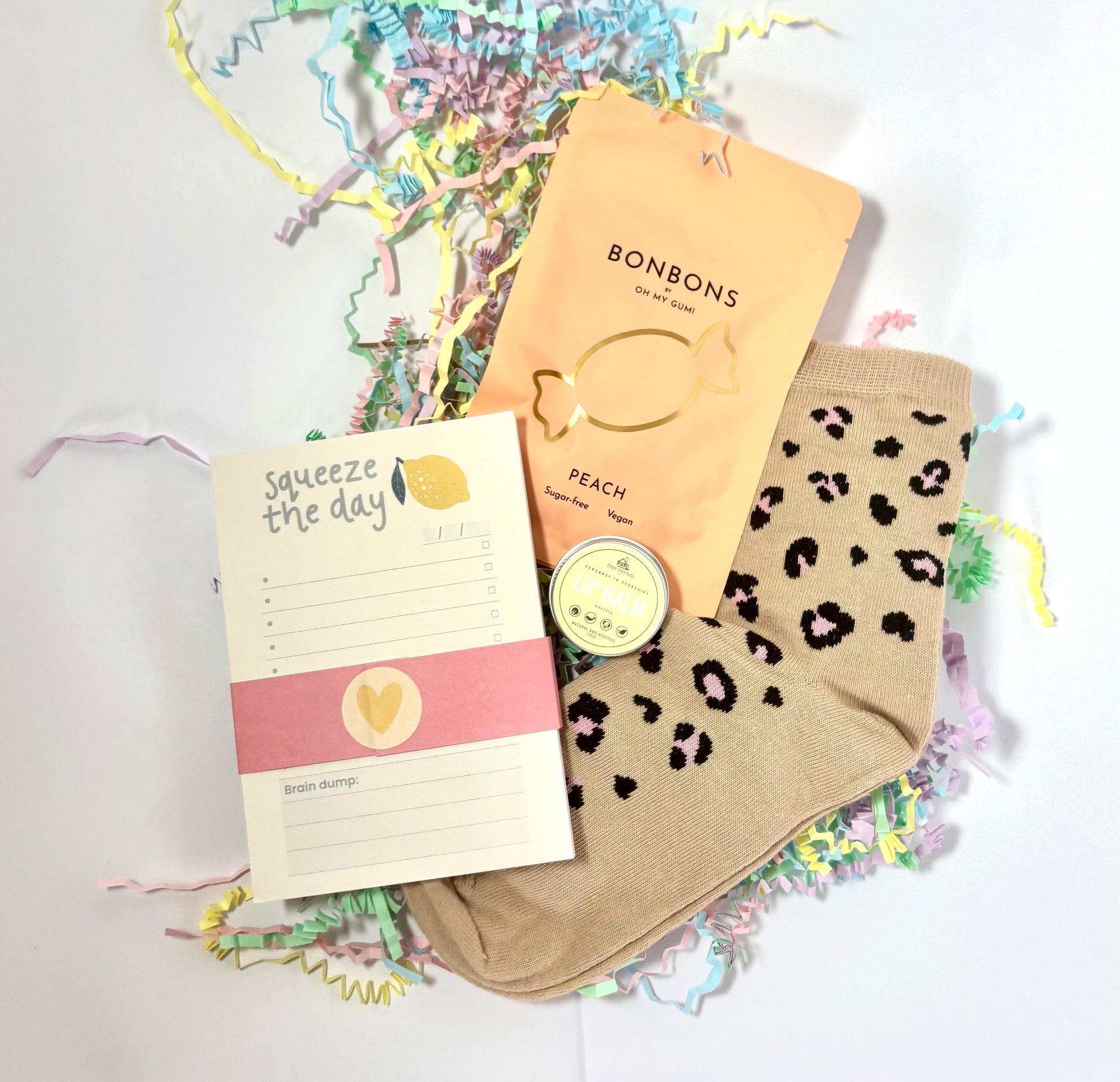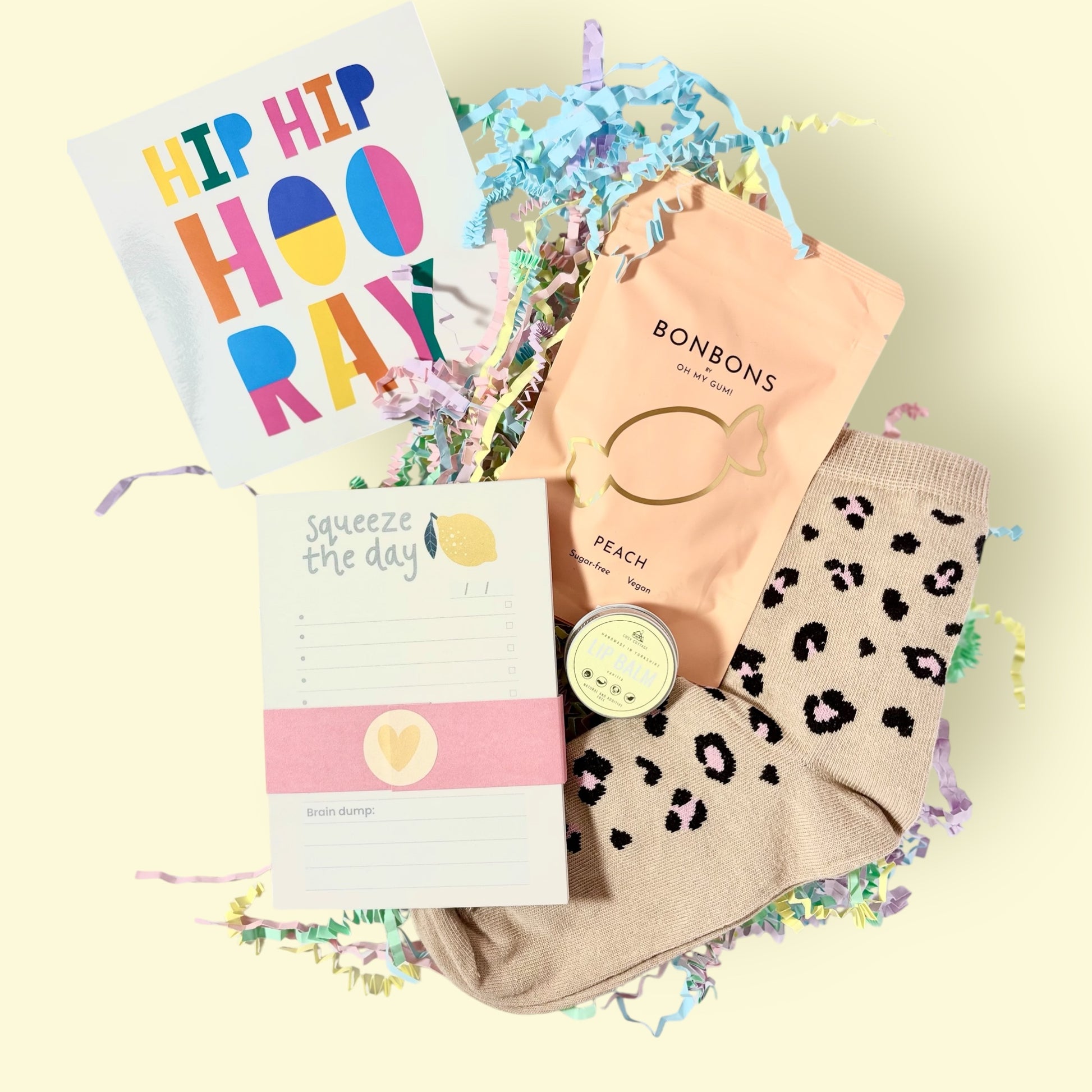 The Ultimate Birthday Box to celebrate someone's special day. Inside you'll find sweet peach Bon Bon's, a dreamy vanilla lip balm, a note pad for brainstorming and statement socks to keep your feet as fabulous as you feel! It is a box full of fun, comfort and birthday vibes!