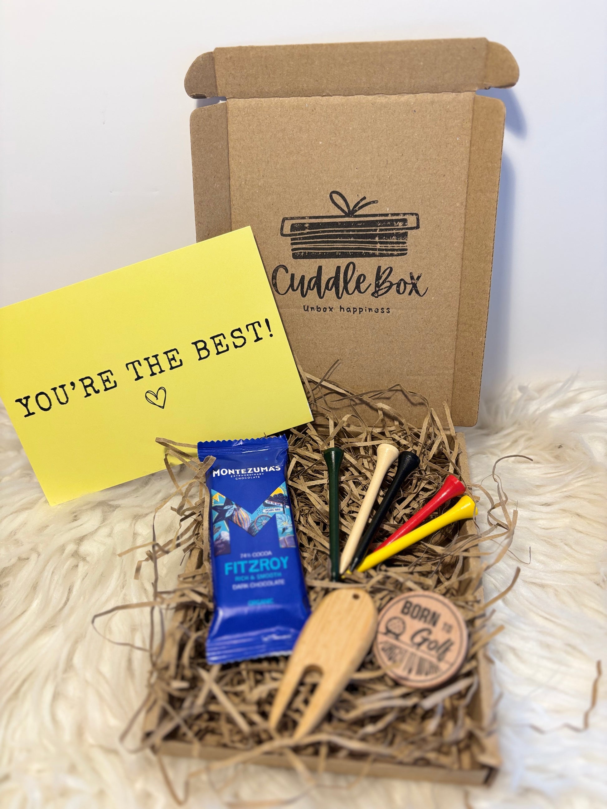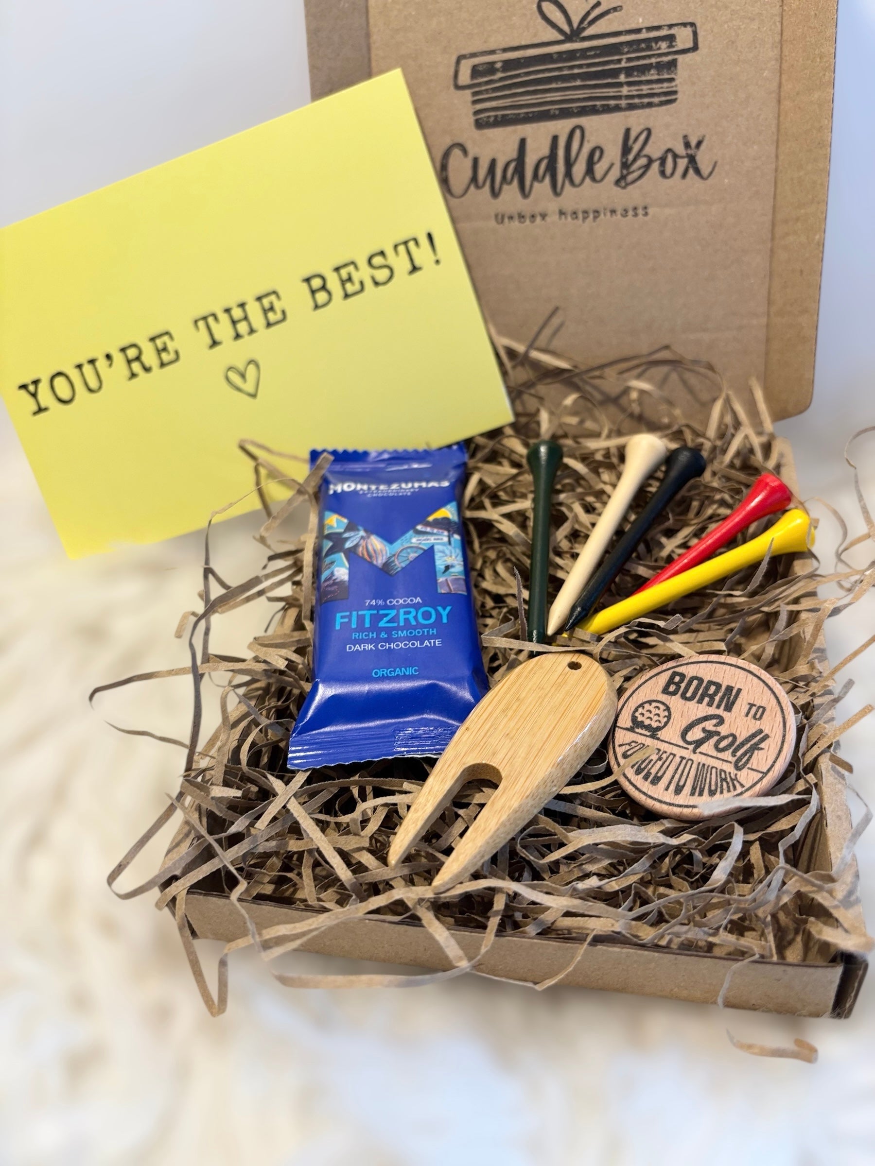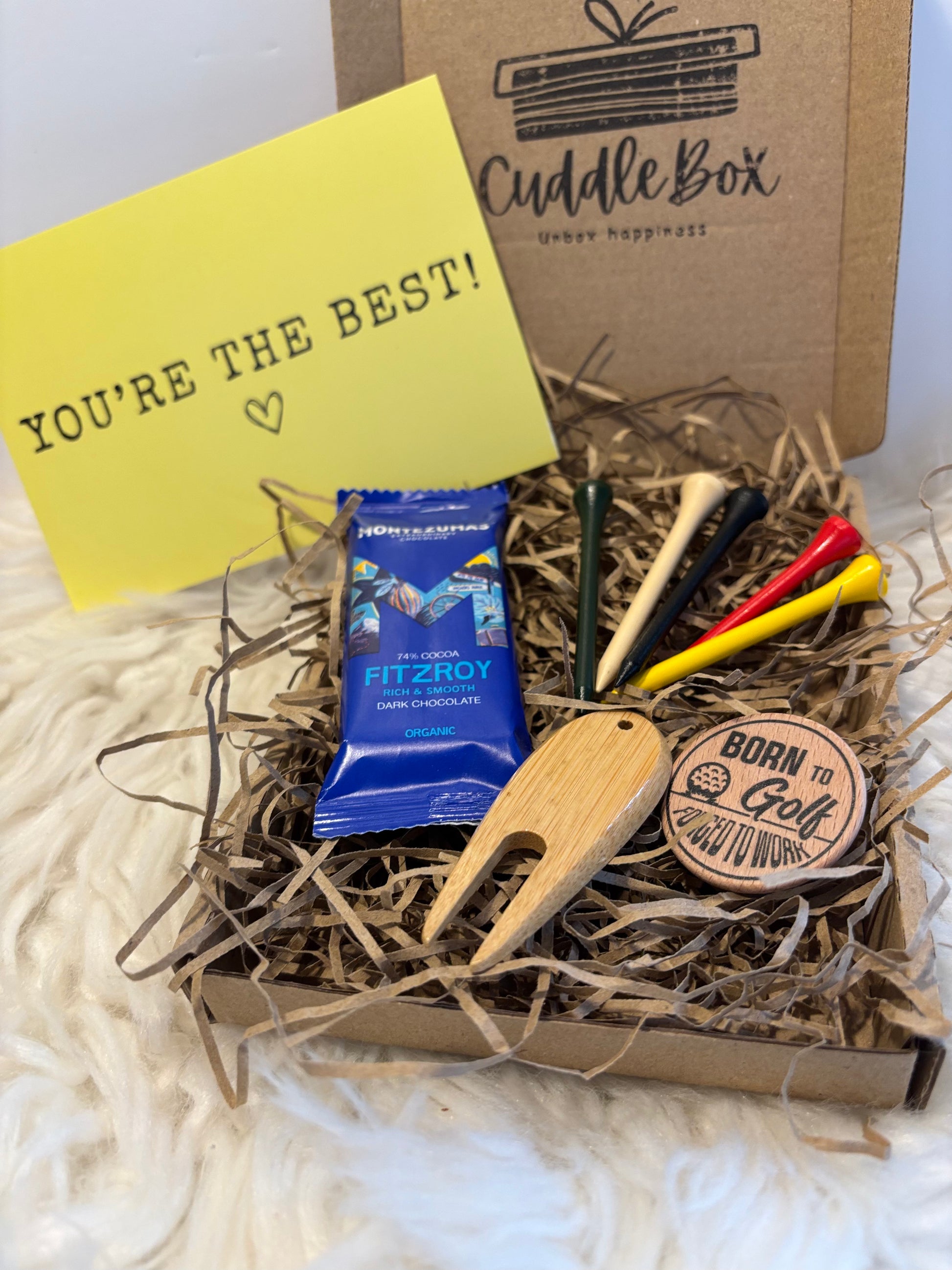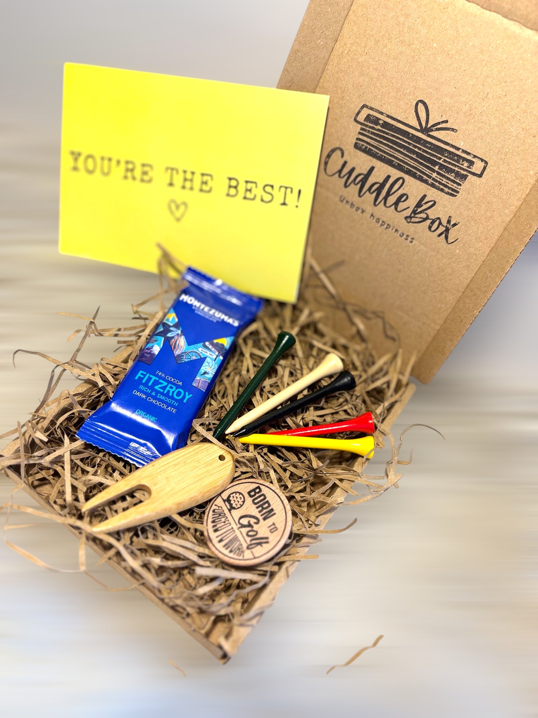 A perfect little pick-me-up for the golfer in your life! Each box is packed with on-course essentials and a sweet surprise. A handy ball marker to track your putts, a pitch fork for keeping the greens pristine, 5 premium golf tees and a chocolate bar for an energy boost between holes.