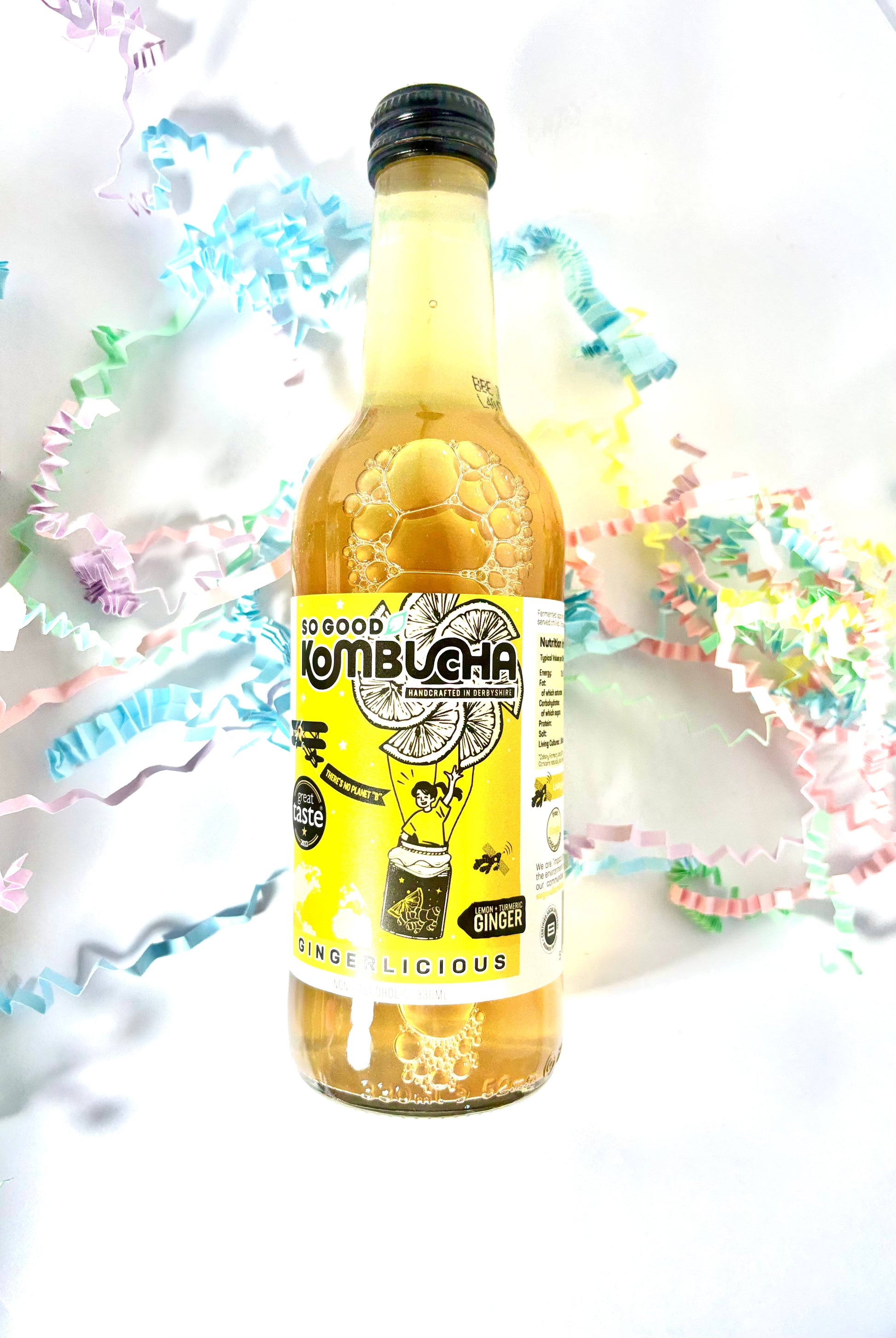 - So Good Kombucha Gingerlicious, A bold mix of organic ginger, lemon, and turmeric with a bit of a kick! Full of healthy bacteria, antioxidants, combined with the detoxifying, immunity-boosting, and anti-inflammatory properties of cold-pressed ingredients for a delicious and healthy combination!