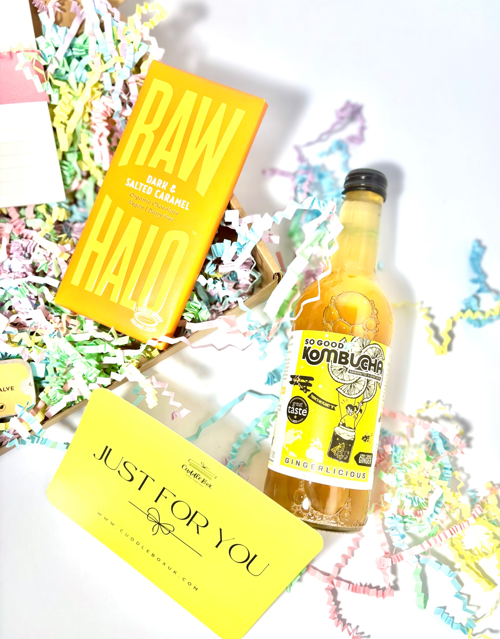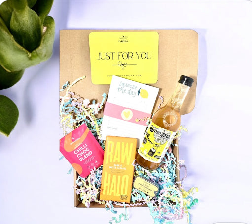 Inside you'll find a Gingerlicious Kombucha to put a zing in your day! A locally sourced sweet orange moisturising salve, great for dry skin or to pop on pulse points. A Raw Halo Dark and Salted Caramel chocolate bar to satisfy your sweet tooth. A cute note pad for jotting down your ideas and a Blendsmiths Chilli hot chocolate to spice up your cosy moments. Perfect for anyone who loves a little sunshine in every sip and smile.