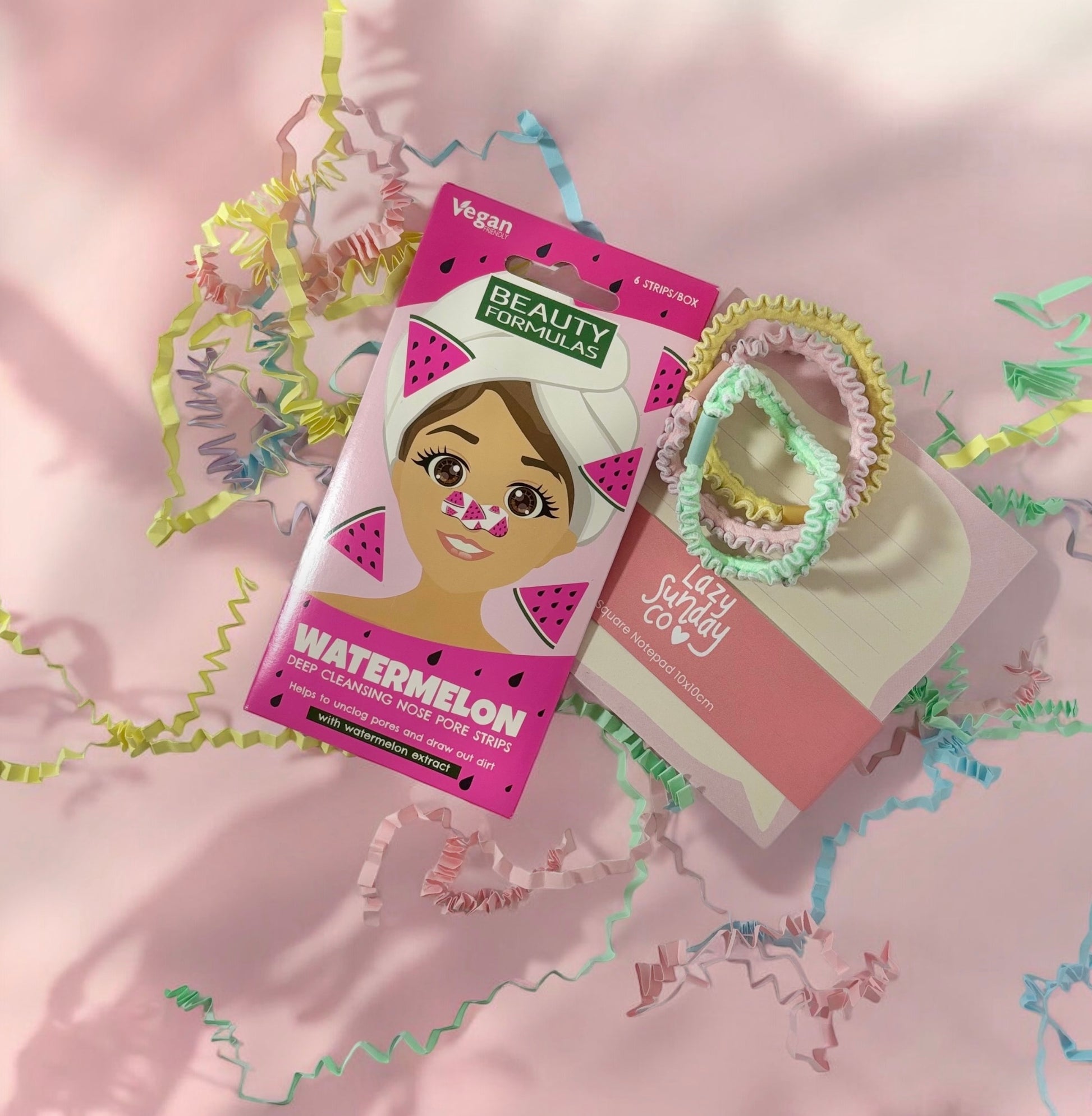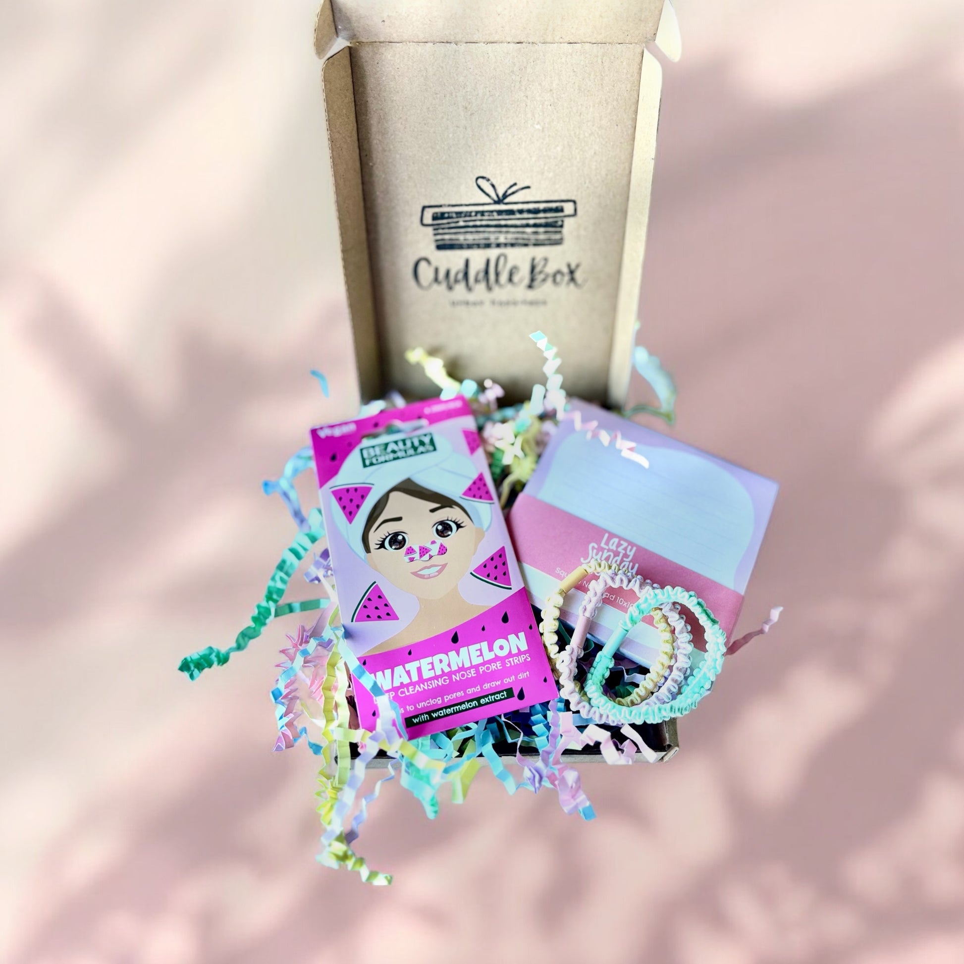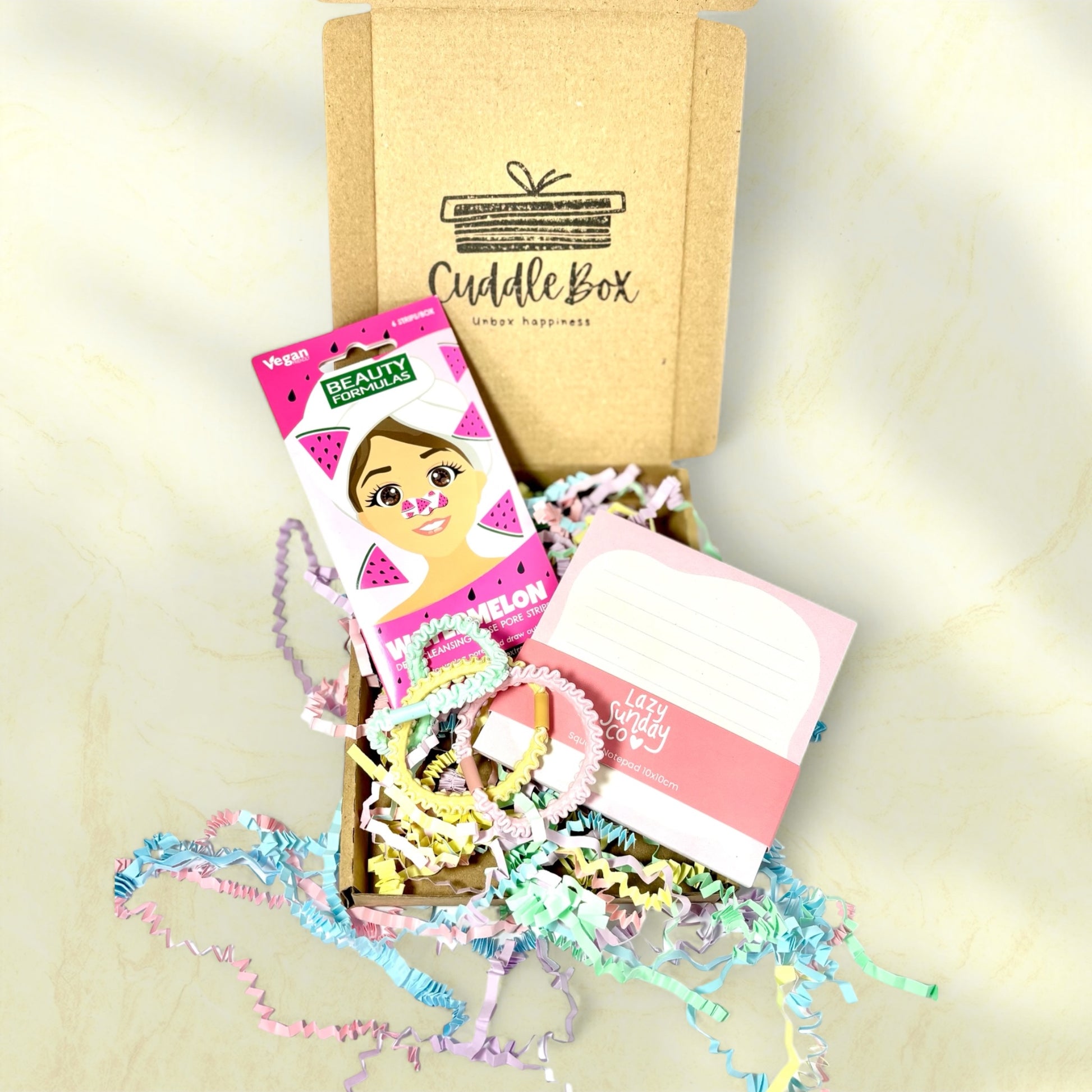 A mini CuddleBox with handpicked goodies that are as fun as they are functional! A cool notepad for all the doodles and lists they'll want to jot down, hair bobbles to keep the hair game strong and a pack of deep cleansing nose pore strips, a quick ,fun way to give your face some love and keep it glowing!